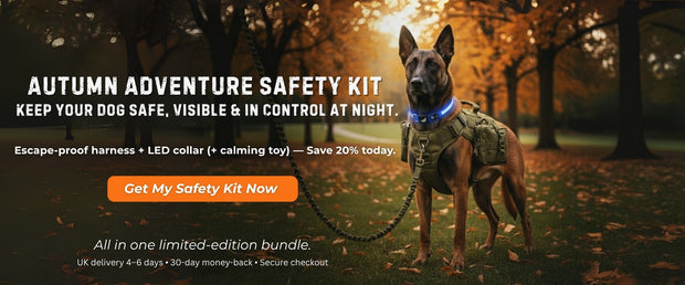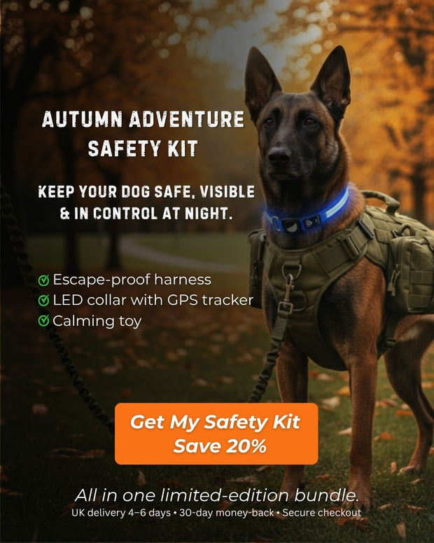This limited-edition autumn bundle keeps your dog safe, visible, and under control — perfect for dark evening walks.